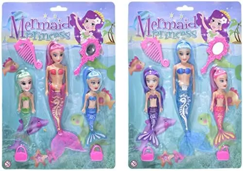 THREE PIECE MERMAID SET WITH ACESSORIES – Each pack contains three assorted coloured mermaids including: blue, pink, purple, green (Colours may vary slightly). Accompanying the mermaids are two handbags a comb and a mirror which allow various avenues for creative play. In the pack there is one large mermaid measuring approx. 21.5cm x 6.6cm (8.46”x2.59”) and two smaller mermaids measuring 13.5cm x 4cm (5.4”x 1.47”). SCREEN FREE FUN WITH FRIENDS – these three packs of mermaid princess dolls with have an ingenious design, her head, arms, and tail can swing flexibly allowing children to create a motion that lets them imagine they’re really swimming! This imaginative play set allows players to go through the simulated Mermaid experience and get them immersed in the joy of role play, bringing them endless fun. RELIABLE HIGHT QUALITY MATIERAL – Each mermaid doll is made of quality plastic material, lightweight and tasteless. They are not easy to break and reliable to use allowing for long time use and confidence when purchasing. THE PERFECT GIFT WITH A VARIETY OF APPLICATIONS – Extensive usage: the little mermaid doll can be applied as a party decoration or cake decoration for birthday party, baby shower, celebration, mermaid theme party. Makes the perfect gift for anyone that loves mermaids they are also the perfect decoration to any bedroom or kids’ bathroom. As they are completely plastic they can be used in the bath but we recommend thoroughly drying the toy after use .