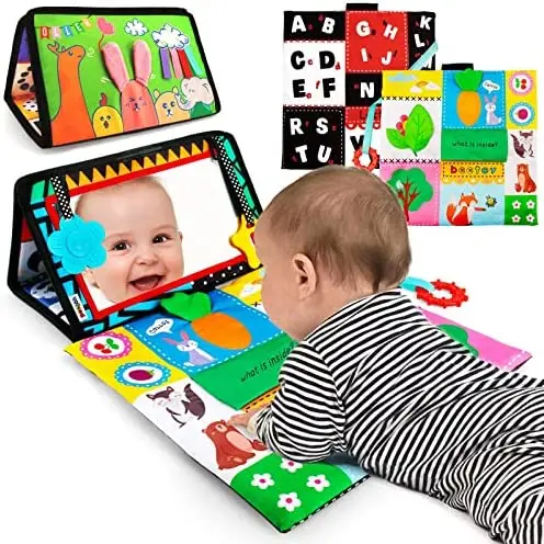 beetoy Tummy Time Mirror Toys, High Contrast Sensory Toys for Babies Activity Montessori Newborn Toys with Crinkle Cloth Book & Teether for Foldable Baby Toys 0 3 6 Months