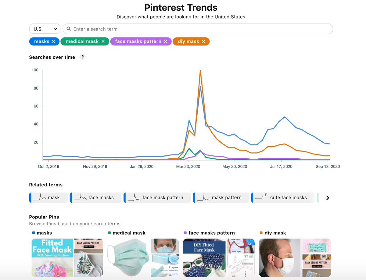 Aşağıda görebileceğiniz gibi, Pinterest’te yüz maskeleriyle ilgili aramalarda oldukça epik bir artış var. Bu arama davranışı, 2020 yılının Mart ayındaki Covid 19’un yüksekliğiyle tam olarak örtüşüyor.