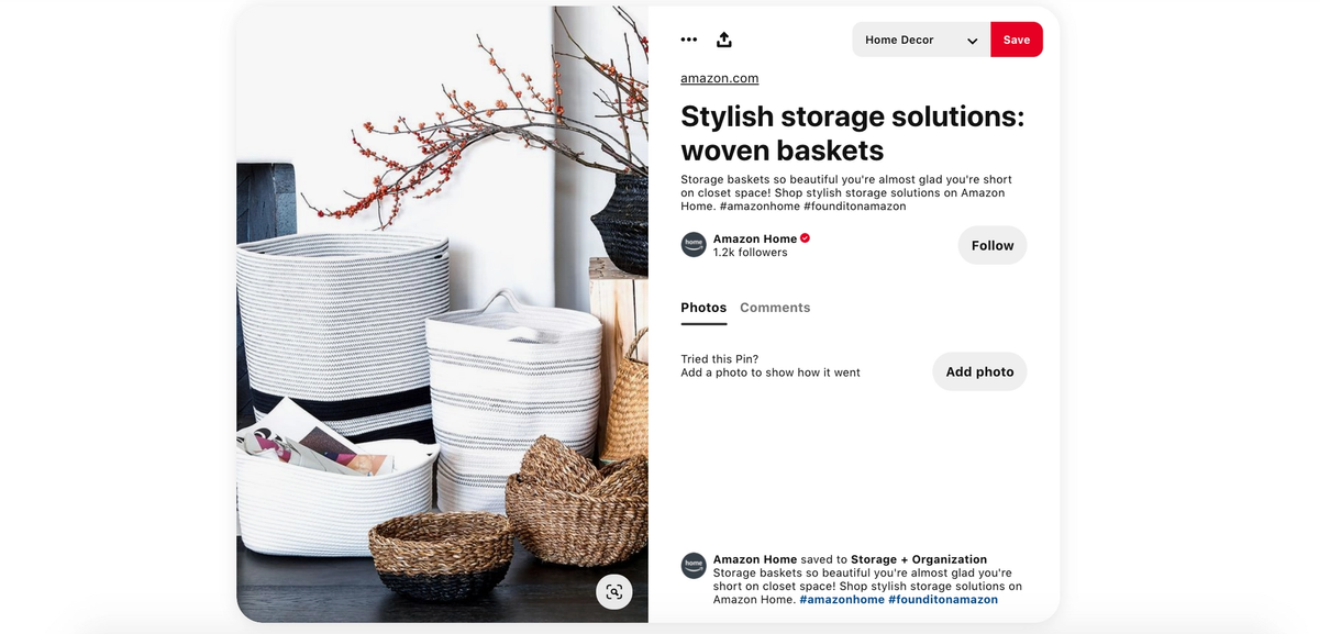 Bu, kullanıcının hesabına bir resim, tasarım veya video görseli kaydetmesidir. Her pin orijinal kaynağa geri döner, yani bir bağlantı içerir. Pin eklemek, kullanıcıların sunduğunuz ürün ve hizmetleri keşfetmesine olanak tanır. Aşağıda daha ayrıntılı olarak tartışılan, oluşturabileceğiniz veya kaydedebileceğiniz çeşitli pin türleri vardır.