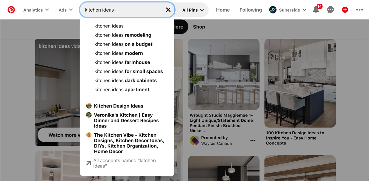Örneğin, mutfak ürünlerini tanıtmak isteyebilirsiniz. KW fikirlerinizi Pinterest’e yazın ve nelerin önceden doldurulduğunu görün: