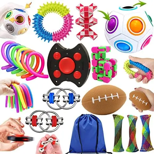 Chennyfun fidget toys Set is great for kids and people with OCD or high stress/anxiety levels. Bring these sensory toys in schools, classrooms, and offices, during travel, or at church. Keeps hands and minds busy for a long time. It can reduce stress, relieve anxiety, help reduce the use of electronic equipment, exercise arm strength, and bring more fun to your life. Package Includes: 6* Stretchy Strings 1* Magic Rainbow Ball 1* Mini Rugby 1* Twisty Magic Ruler 2* Flip Chains 1* Infinity Cube 1* Spiky Sensory Ring 3* Colorful Mesh Toys 1* Wacky Tracks Snap 1* Storage Bag Warning:This product contains small parts, Not suitable for children under 3 years old !