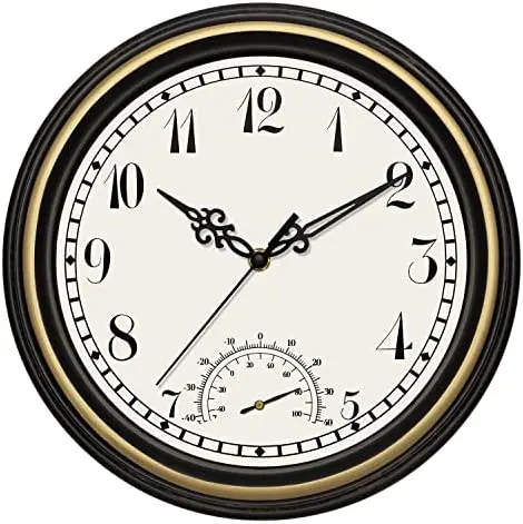 Foxtop Indoor Outdoor Waterproof Wall Clock with Thermometer, Retro Silent Non-Ticking Round Clock for Garden Patio Yard Bathroom Home (12 Inch, Black Gold)