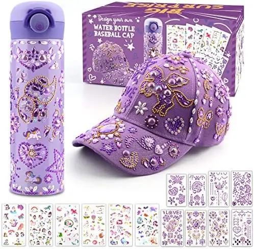 Gifts for Girls DIY Water Bottle and Baseball Cap, Decorate Your Own Water Bottle with Glitter Gem and Unicorn Stickers, Girls Birthday Present Age 4 5 6 7 8 9 10, Cap & Bottle Craft Kit for Kids Girl