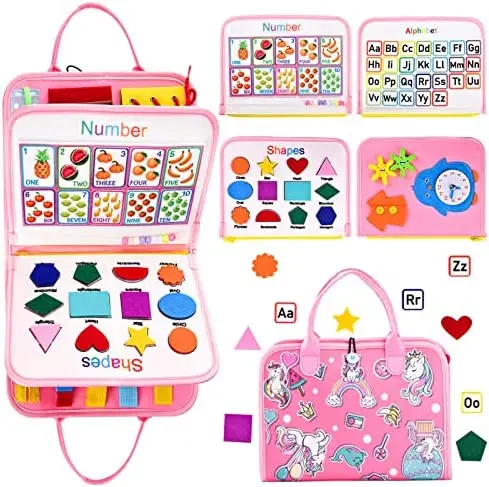 GYBOOM Busy Board Montessori Toys for Toddler,Quiet Book,Sensory Board for Learning Fine Motor Skills, Preschool Educational Toys for 1-6 Year Old Boys Girls Travel (Pink)