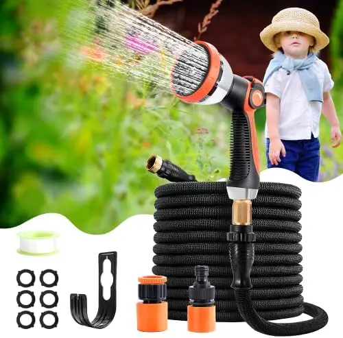 All-in-One Kit: It comes with 1 garden hose (50ft), 1 spray nozzle, 1 carrying bag, 1 hose hanger, 2 leak-proof tapes, and 6 spare washers. The model sold in European countries also has adapter and connector set to perfectly connect 1/2” and 3/4” taps.