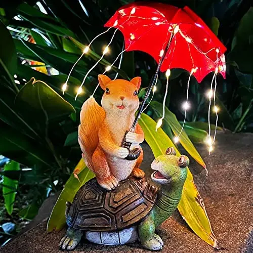 lifemet Garden Ornaments Outdoor, Solar Statue | Squirrel Siting on Turtle Holding an Umbrella with String Lights – IP65 Waterproof Garden Gifts for Lawn Yard Flowerbed Art Decoration