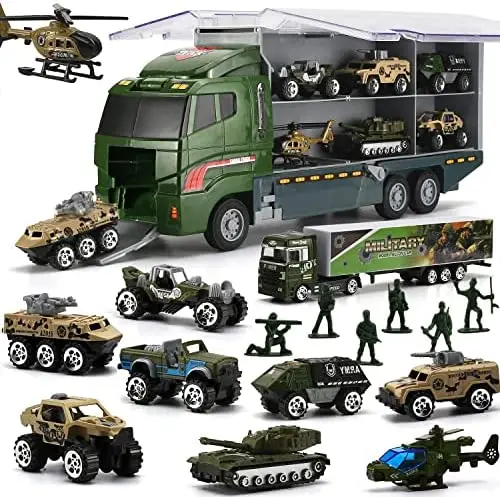Military Carrier Truck (26 in 1) with Soldier Men playset, Mini Die-cast Battle Car in Transport Truck, Army Toy Double Side Vehicle for Kid Children Girl Boy Play Birthday Party Gift