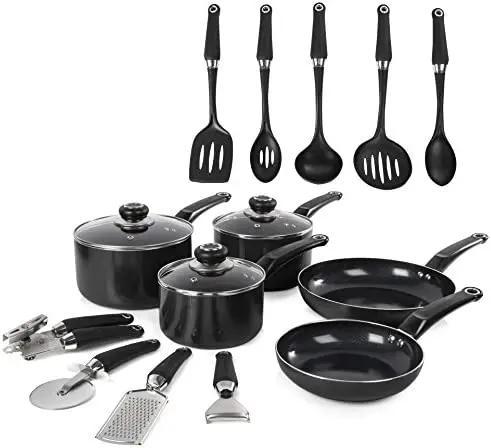 The pans and accessories in this kitchen set require no more than a simple hand wash to maintain their appearance and performance, making the set easy to clean as well as use.