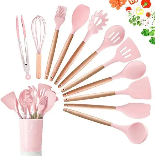 SGAONSN Kitchen Utensil Set, Silicone Cooking Utensils with Natural Wooden Handles,Nonstick Kitchen Tool Turner Tongs (12pcs) Pink