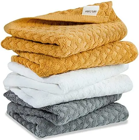 SO Products Pack of 6 Kitchen Towel Set Ideal for Use as Kitchen Towels Hand Towels and Wash Cloths. Each Set Contains 2 Mustard Towels, 2 Grey Towels, 2 White Towels in Chunky Weave Design.