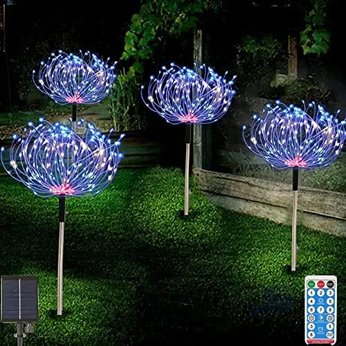 Solar Garden Lights Outdoor 4 Pack 480 LED Firework Landscape Path Lights Solar Powered Starburst Fairy Lights Waterproof 8 Lighting Modes with Remote Control for Patio Christmas Party Yard Decorative